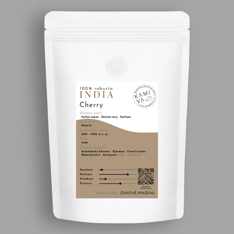 India Cherry je kvalitní 100% robusta s výrazným, intenzivním projevem. V chuti dominuje čistá, přímočará hořkost doplněná tóny tmavého kakaa, dřeva a lehké zemitosti. Tělo je plné a hutné, což dodává šálku výraznou sílu a dlouhou, hořkou dochuť s jemnou kořenitostí.